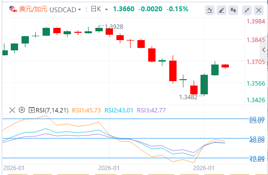 上行方面,主要阻力位于九日均线1.3660,与上升通道约1.3700的上界对齐。若日线收盘价位于汇合点之上,将打开复苏空间,支撑USD/CAD汇对接近50日均线1.3787。进一步上涨将暴露出1月16日达到的九周高点1.3928。