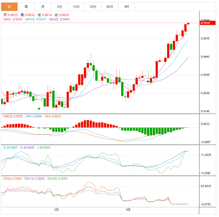 周二,美元兑瑞郎徘徊在0.9560-90区域,但在临近华尔街收盘时,果断突破了0.9600这个数字,并接近今年迄今为止的高点0.9623。