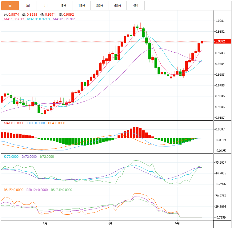瑞郎方面,投资者正等待瑞士央行(SNB)周五的利率决定。5月份瑞士CPI已攀升至2%以上,这可能会让瑞士央行暂停加息,继续保持中性立场。然而,花旗银行(Citibank)的一份报告称,瑞士央行可能在下周加息。