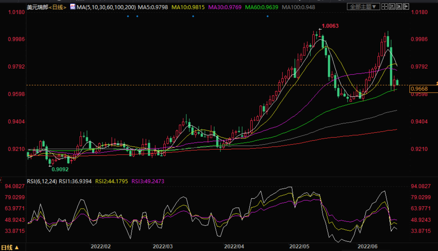 基本面上,瑞士央行的官方利率已经达到-0.25%。在过去的15年里,瑞士央行一直在利率上保持稳定的立场,以降低瑞士法郎的吸引力,因为这将为瑞士经济带来更多的业务。考虑到通胀冲击,瑞士央行跟随其他西方国家领导人的脚步,宣布大幅加息。瑞士央行(SNB)主席克里斯·乔丹(Chris Jordan)出人意料地宣布加息,这表明瑞郎不再被高估,加息将支撑瑞郎多头走向未来。