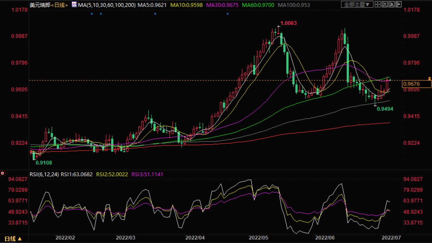基本面上,前一交易日美元/瑞郎一个月风险逆转率录得5月初以来的最大升幅升至0.2000。值得注意的是,风险逆转率指看涨期权和看跌期权之间的价差,体现的是看涨和看跌市场押注之间的差异。瑞郎货币对未能验证期权市场看涨倾向,投资者正处在观望当中,而美联储会议纪要和美国6月ISM服务业采购经理人指数将成为新的催化剂推动市场波动。