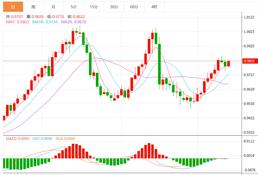 技术上,本月水平阻力区域0.9875也构成上行阻力。一旦升破0.9875,汇价不排除将升向6月高点1.0050。