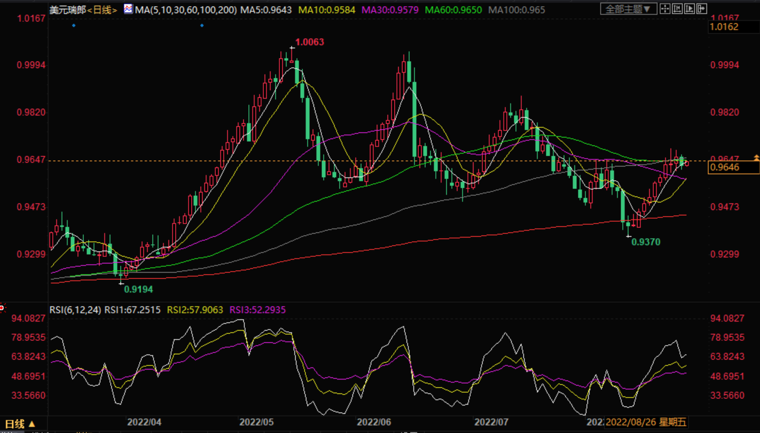技术面上,美元/瑞郎在61.8%斐波回档位0.9690(7月14日高点0.9886至8月11日低点0.9671之间跌势)遇阻。看涨旗形形态支撑该货币对多头。汇价大涨后陷入盘整形成看涨旗形。该形态的盘整阶段反映了一个主动性买入机构,多头在建立看涨倾向后建立多头。若果断升破61.8%斐波回档位0.9690将推动该资产指向7月21日高点0.9740,然后为7月18日高点0.9790。