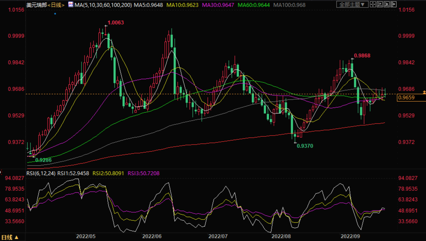 基本面上,美联储已将利率目标定为4.6%,并希望到2023 年底达到4.4%,远高于此前预期的高水平3.8%。这一政策带来两种可能,要么继目前的加息步伐后通胀疲弱,要么通胀飙升剧烈,需要尽快得到遏制。瑞郎方面,投资者正在等待瑞士国家银行公布利率决定。预期瑞士央行行长托马斯·乔丹将宣布上调利率 75 个基点。瑞士央行每个季度将公布利率政策,预期瑞士央行将进一步加息。瑞士央行若加息75 个基点将使利率录得正值0.5%。十年来瑞士央行利率首次将进入正区。