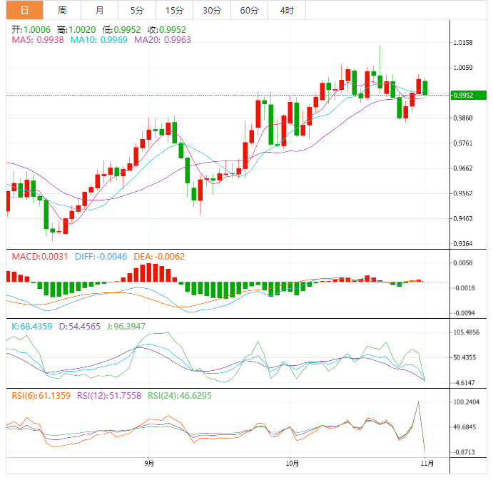 基本面上,继录得三连涨后美元/瑞郎获得喘息。美元/瑞郎整理于1.0010-15区间。这样一来,瑞士货币(CHF)对整理于一周内最高水平附近,同时最新出现温和下跌。展望未来,美元/瑞郎投资者可能会寻求更多线索来延续最新回调势头,因此瑞士10月SVME採购经理人指数将成为焦点,预期为56,前值57.1。在此之后,美国ISM制造业採购经理人指数可能放缓至50.0,前值为50.9,将指引美元/瑞郎波动。此外,美国10月标准普尔全球制造业採购经理人指数,预计初值为49.9,同时美国还将公佈9月JOLTS职位空缺,期值为1000万,前值为1005.3万,也将成为市场焦点。