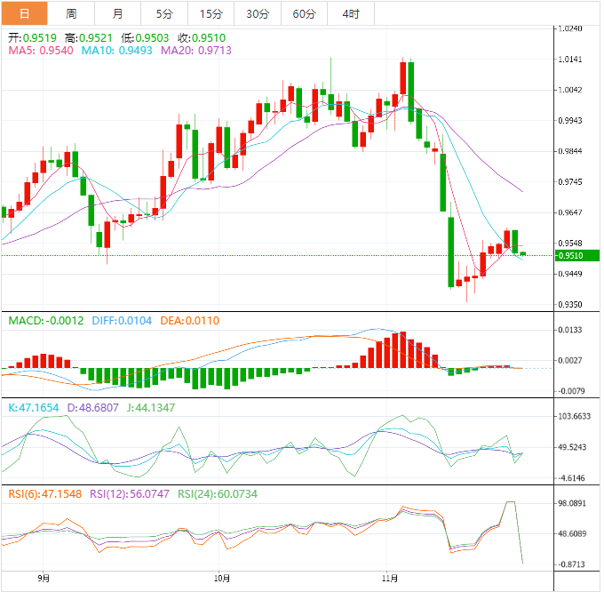 如果美元兑瑞郎的多头能够控制住局面,那么11月11日在0.9900阈值附近的高位波动将对观察该货币对的进一步上行势头非常重要。如果该货币对在0.9900上方保持坚挺,则不排除其上升至1.0150附近的月高位的可能性。