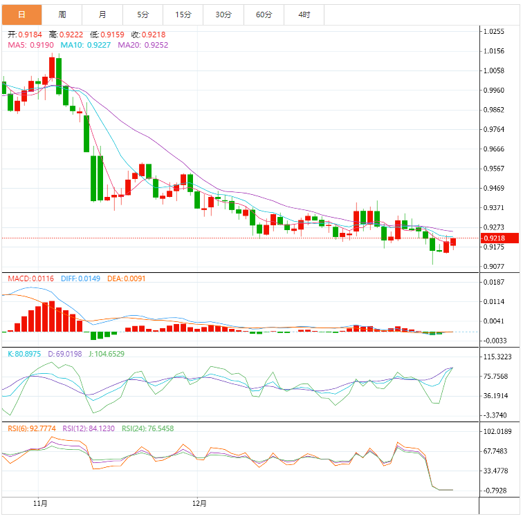 基本面上,美元/瑞郎维持疲弱,延续前日回调势头,结束两日上升趋势,处在0.9180附近。美元/瑞郎验证MACD信号看跌,同时接近上周三以来的上升支撑线,截至发稿时接近0.9160。