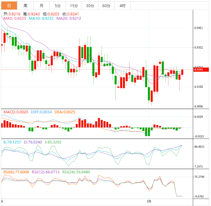 基本面上,美元/瑞郎企稳于0.9225附近,并刷新盘中高点。在这期间,美元/瑞郎延续前日自一周最低水平反弹的势头,构筑为期一周的看涨三角形形态。美元/瑞郎目前上涨目标是上述三角形形态顶部最新处在0.9250附近。