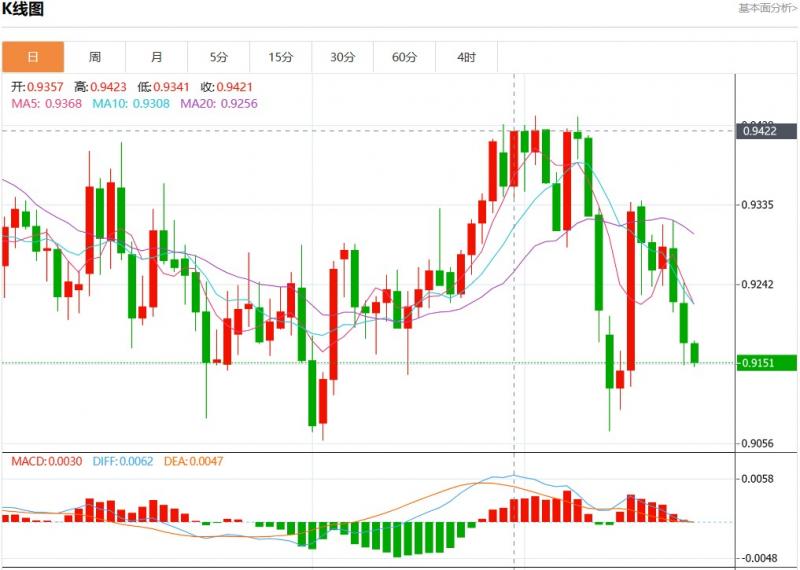周四盘中,美元瑞郎报0.9153,跌幅0.25%。