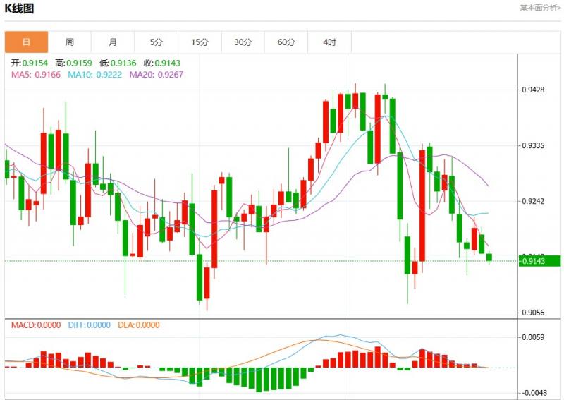 周二盘中,美元瑞郎报0.9142,跌幅0.13%。