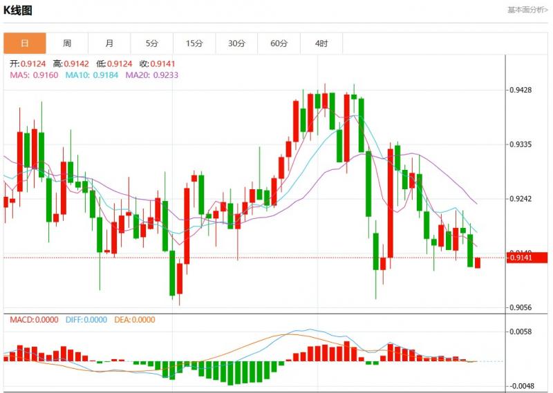周五盘中,美元瑞郎报0.9141,跌幅0.16%。