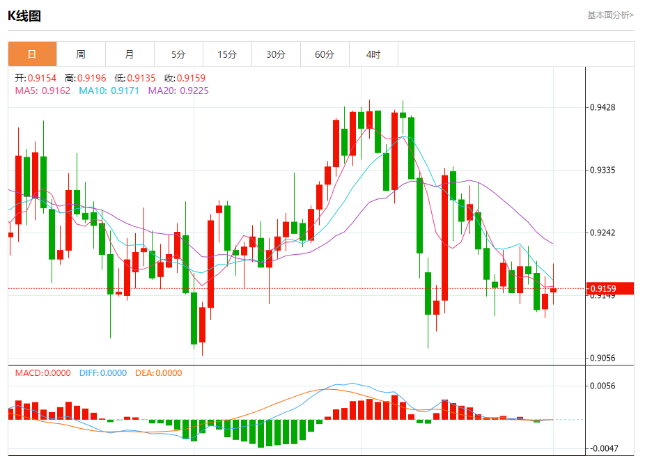 周一纽盘,瑞郎兑美元交投于0.9159,涨幅为0.05%。