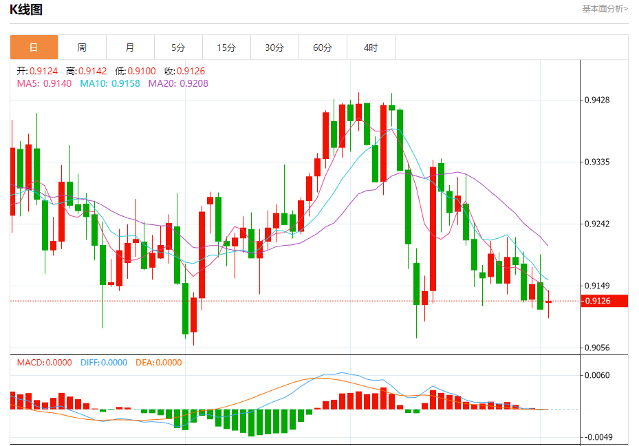 周二纽盘,瑞郎兑美元交投于0.9129,涨幅为0.14%。
