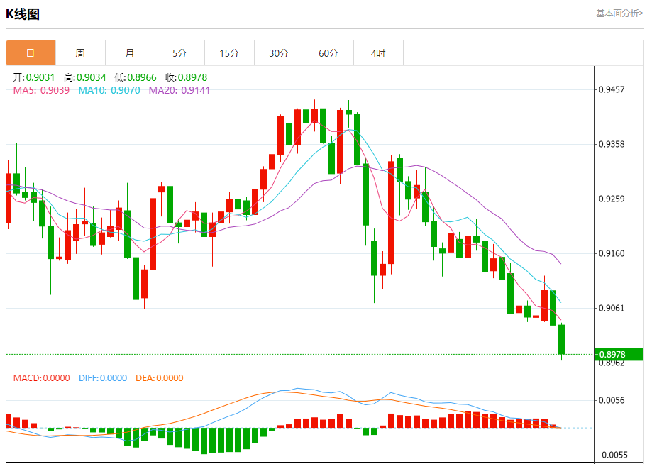 周三纽盘,瑞郎兑美元交投于0.8980,跌幅为0.58%。