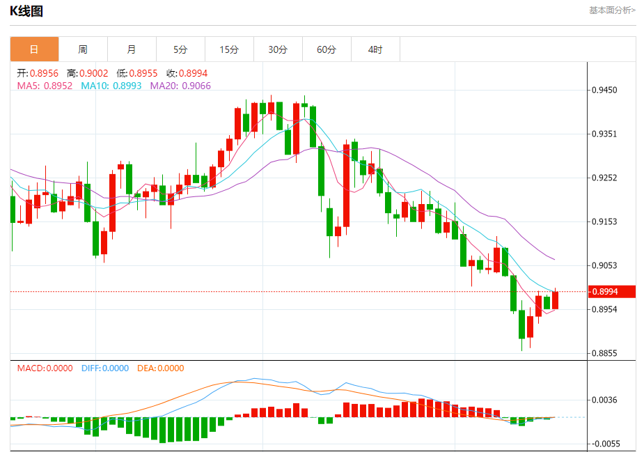 周三纽盘,瑞郎兑美元交投于0.8995,涨幅为0.42%。