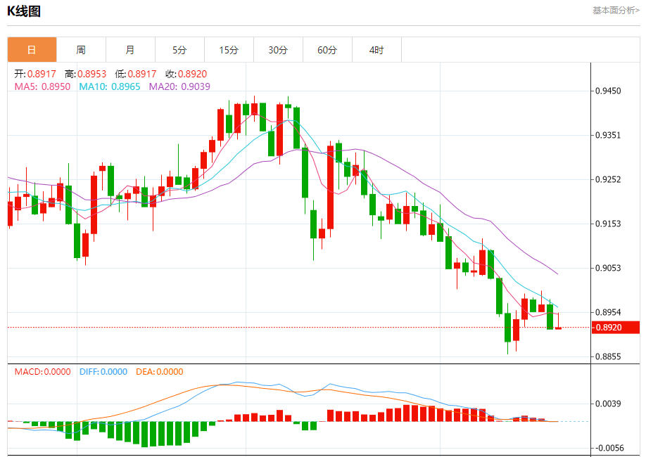 周五纽盘,瑞郎兑美元交投于0.8921,涨幅为0.03%。