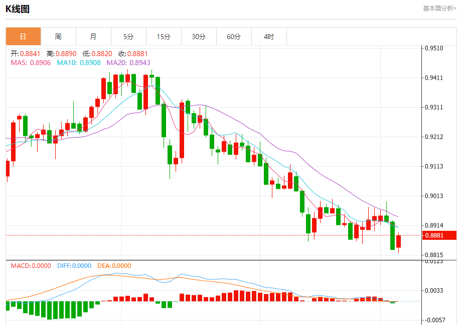 周四纽盘,瑞郎兑美元交投于0.8882,涨幅为0.54%。