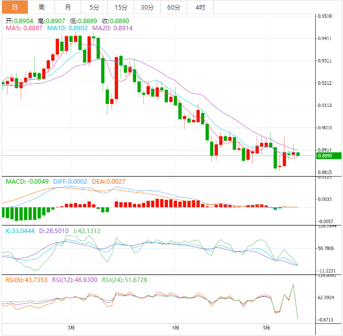 基本面上,虽然自盘中低点反弹至0.8900,但美元/瑞郎依然小幅承压。关键的美国4月通胀数据公佈前市场情绪谨慎令该货币对承压。除了数据前的焦虑,围绕美国债务上限的谨慎乐观情绪和银行问题也让美元/瑞郎回撤。展望未来,鹰派谈论和数据回落背景下,美国4月通胀率将是美元兑瑞郎短期行情的关键,同时美国非农释放的信号不一。若数据表明全球最大经济体的通胀压力上升,近期美联储鹰派押注可能获得认同并可以让美元收窄盘中跌势,录得三日内首日上涨。