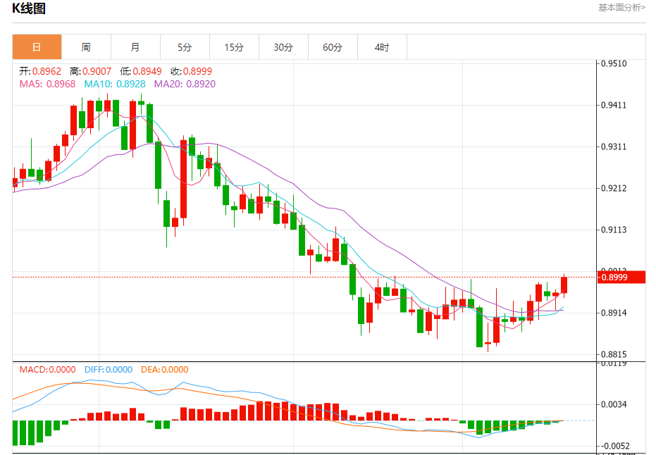 周三纽盘,瑞郎兑美元交投于0.9000,涨幅为0.43%。