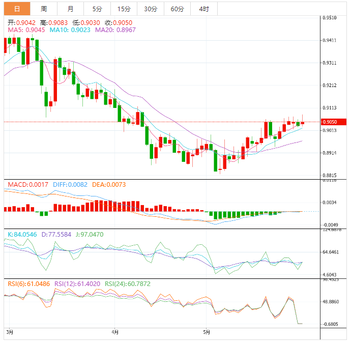 基本面上,美元/瑞郎数度试图突破0.9045后,出现大幅下跌。瑞郎资产吸引了大量的卖盘,因为美元指数非常不稳定,因为美国投资者在因阵亡将士纪念日而延长的周末之后正回归交易。瑞郎将在瑞士第一季度国内生产总值(GDP)数据公佈后继续波动。瑞士第一季度国内生产总值季率期值0.1%,前值停滞不前。第一季度国内生产总值季率年率为0.6%,低于前值0.8%。