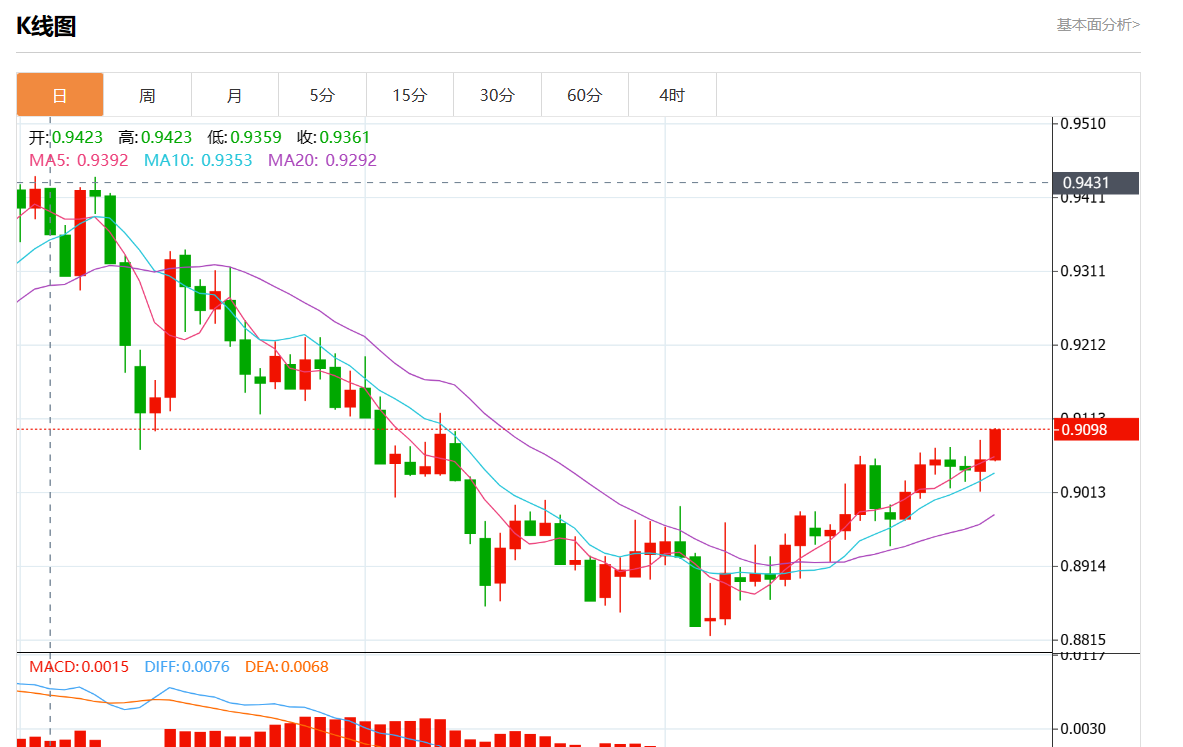 支撑位:0.9125 0.9110 0.9095