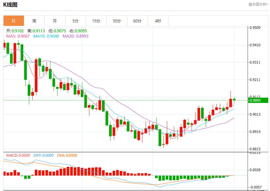 周四纽盘,瑞郎兑美元交投于0.9096,跌幅为0.08%。