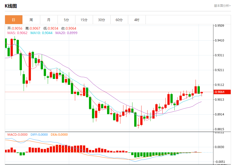 周五纽盘,瑞郎兑美元交投于0.9064,涨幅为0.11%。