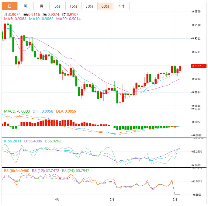 基本面上,美元/瑞郎在0.9100附近买盘加大,涨至0.9105。在这期间,美元/瑞郎连续第二天上涨,同时守住前日从0.9040支撑位汇合处的反弹势力。也就是说,MACD信号看涨且相对强度指标(14)坚挺但未处在超买,50天指数移动均线(EMA)和5月初的上行趋势线汇合处支持美元/瑞郎反弹。