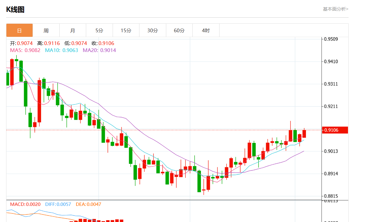 周一盘中,美元/瑞郎最新报0.9105,日图涨0.19%