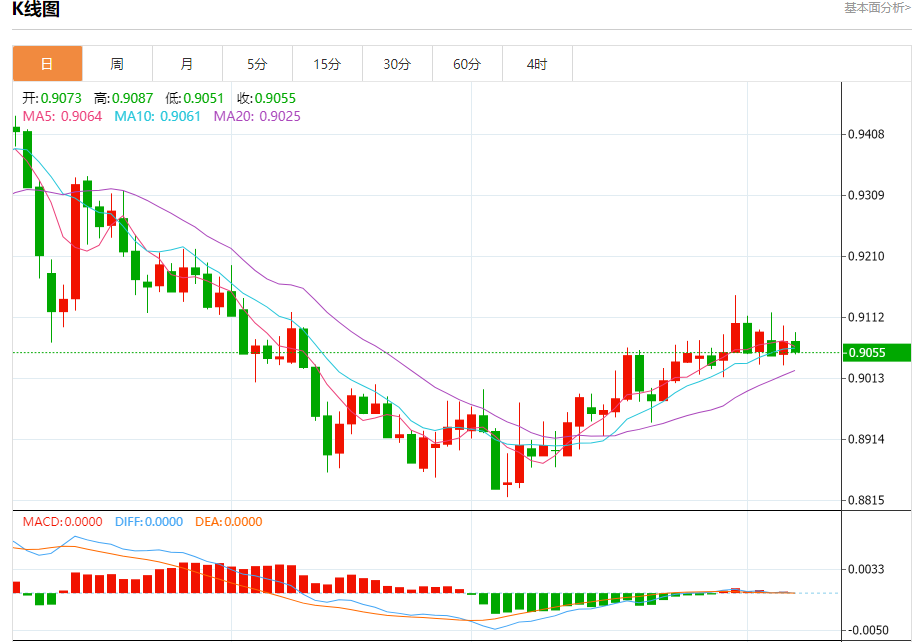 周三纽盘,瑞郎兑美元交投于0.9057,跌幅为0.18%。
