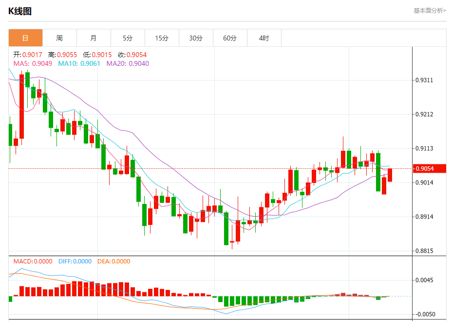 周一纽盘,瑞郎兑美元交投于0.9055,涨幅为0.28%。