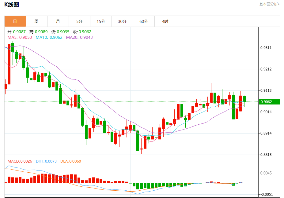 周二纽盘,瑞郎兑美元交投于0.9063,跌幅为0.29%。