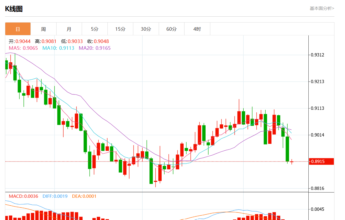 周五盘中,美元/瑞郎最新报0.8916,日图跌0.01%