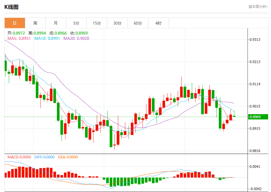 周三纽盘,瑞郎兑美元交投于0.8970,跌幅为0.10%。