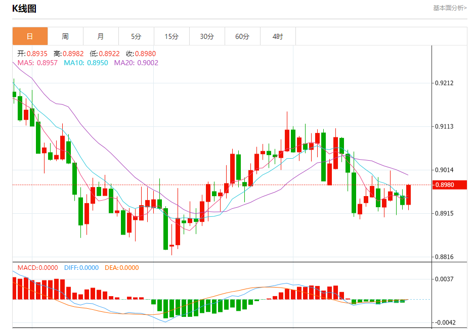 周三纽盘,瑞郎兑美元交投于0.8981,涨幅为0.50%。