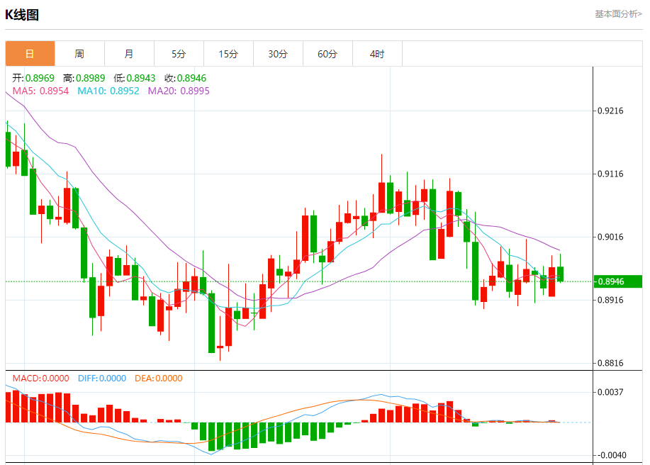 周四纽盘,瑞郎兑美元交投于0.8947,跌幅为0.27%。