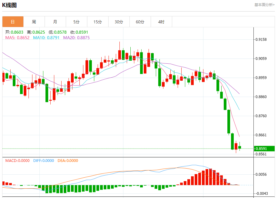 周一纽盘,瑞郎兑美元交投于0.8593,跌幅为0.30%。