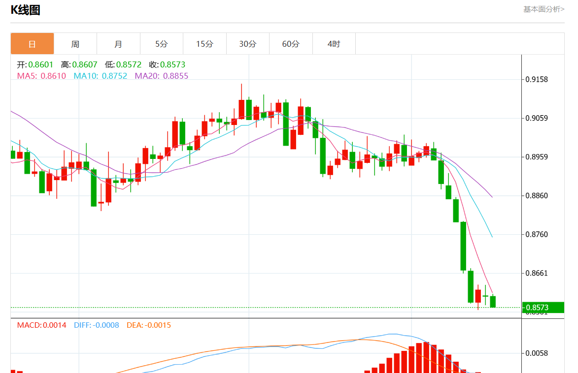 周二盘中,美元/瑞郎最新报0.8572,日图跌0.35%