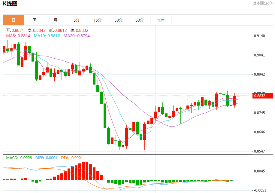 周五纽盘,瑞郎兑美元交投于0.8833,跌幅为0.01%。