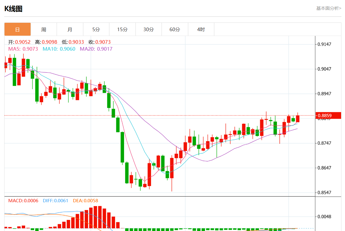 周二盘中,美元/瑞元报0.8865,涨幅0.33%。