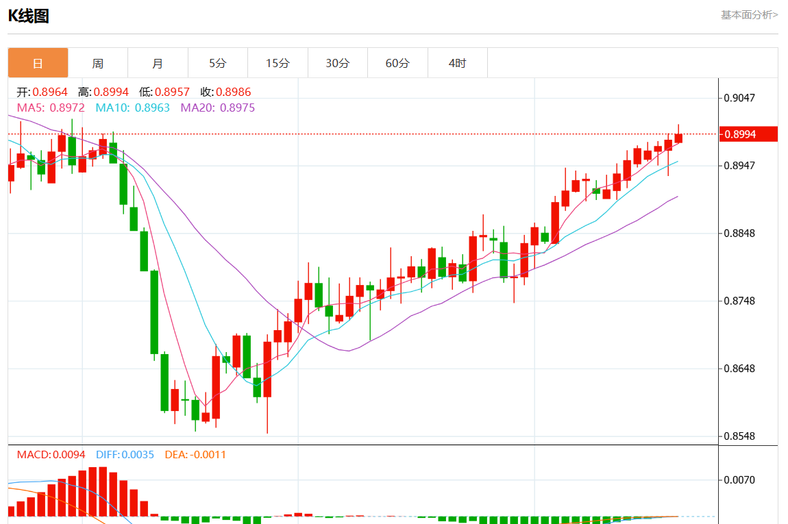 周四盘中,美元/瑞元报0.8993,涨幅0.09%。