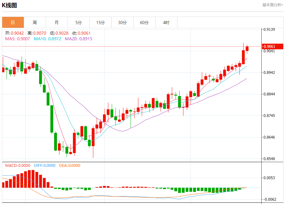 周五纽盘,瑞郎兑美元交投于0.9064,涨幅为0.20%。
