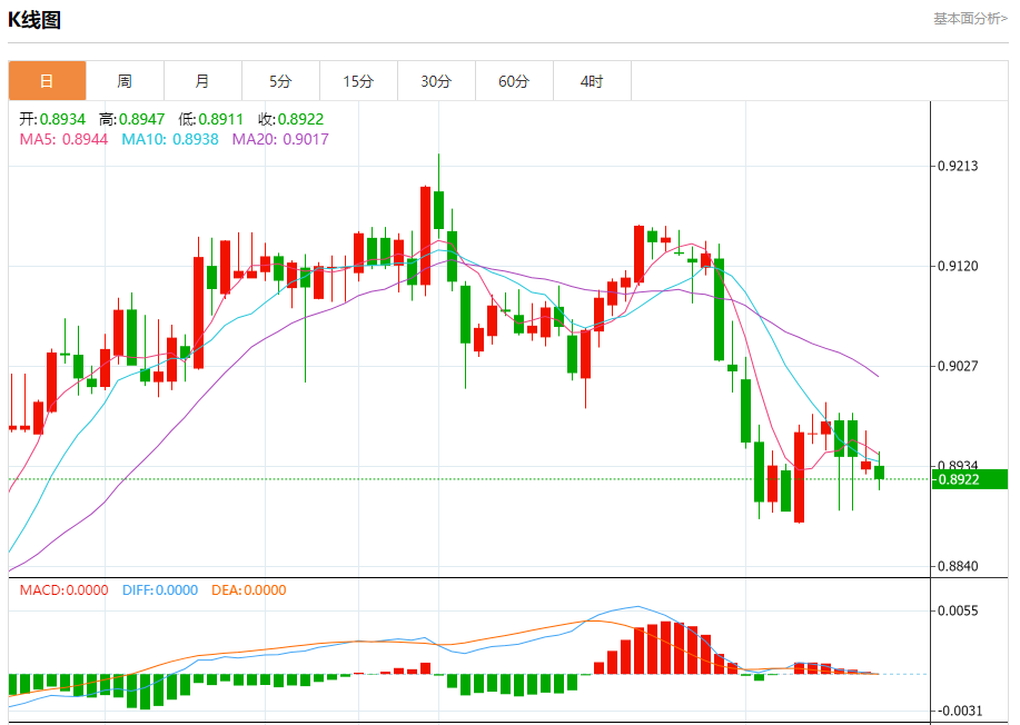 周五纽盘,瑞郎兑美元交投于0.8924,跌幅为0.18%。