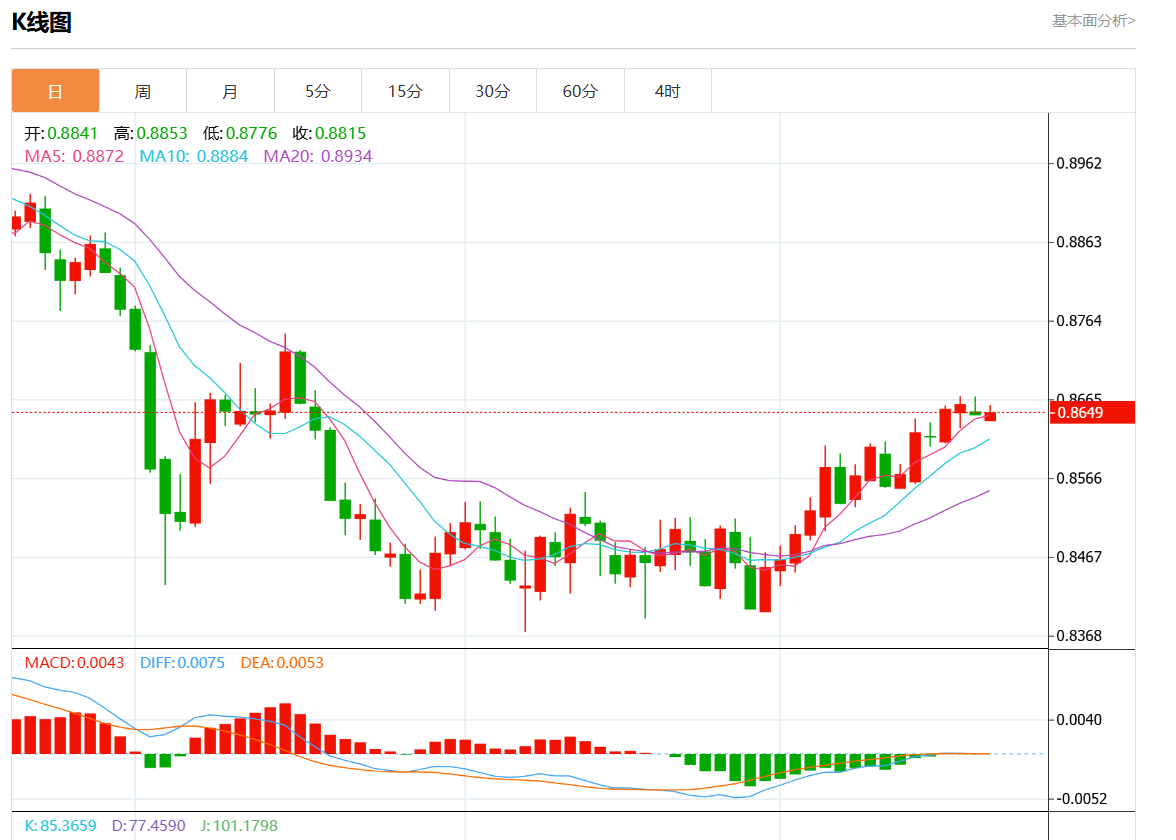 周一盘中,美元/瑞元报0.8648,涨幅0.01%