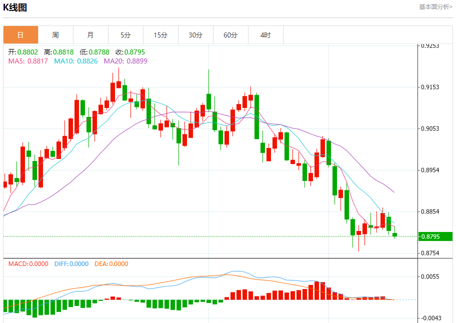 周二纽盘,瑞郎兑美元交投于0.8796,跌幅为0.15%。