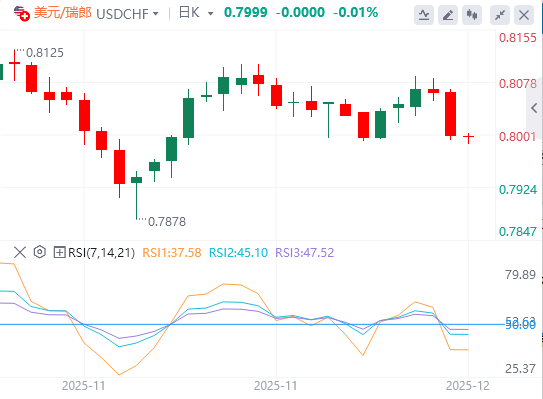 美元/瑞郎在周四欧洲交易日努力回升,此前一天已重回三周低点0.7985。瑞士法郎对显示出横盘趋势,形成一个下降三角形,其水平支撑位于11月19日低点0.7985,而下降的边界则从11月高点0.8124绘制。