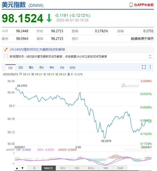 6月1日,美元指数(98.1056 -0.1659 -0.17%)短线下行,人民币(7.1365 0.0001 0.00%)中间价报7.1315,上调1点,上一交易日中间价报7.1316,在岸人民币上一交易日收报7.1455。