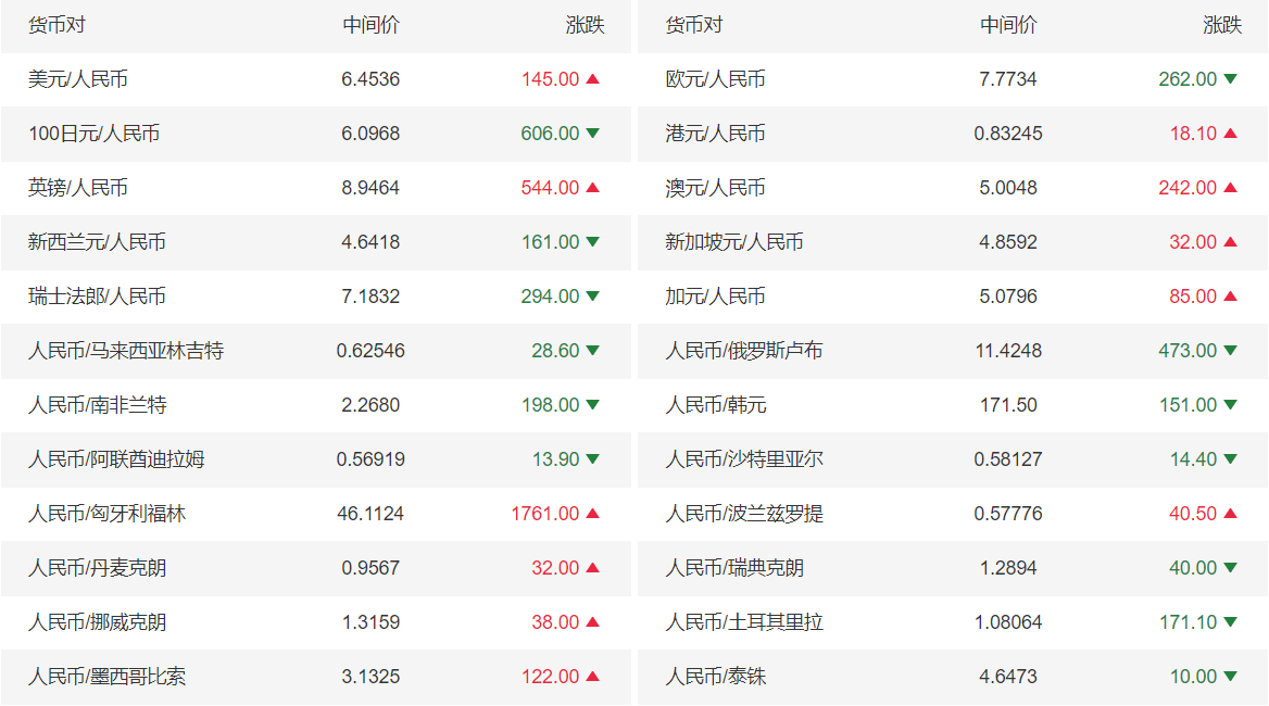 今日美元兑人民币报6.4536,上调(人民币贬值)145点;上一交易日报6.4391;