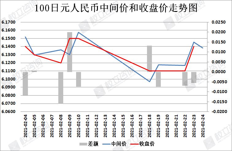 2021/2/24:100日元/人民币中间价报6.1382,中间价下调74点。中间价今天略微下调,中间价调整呈现出一天上调一天下调的规律。上个交易日收盘价低低于中间价,日内波幅较小。