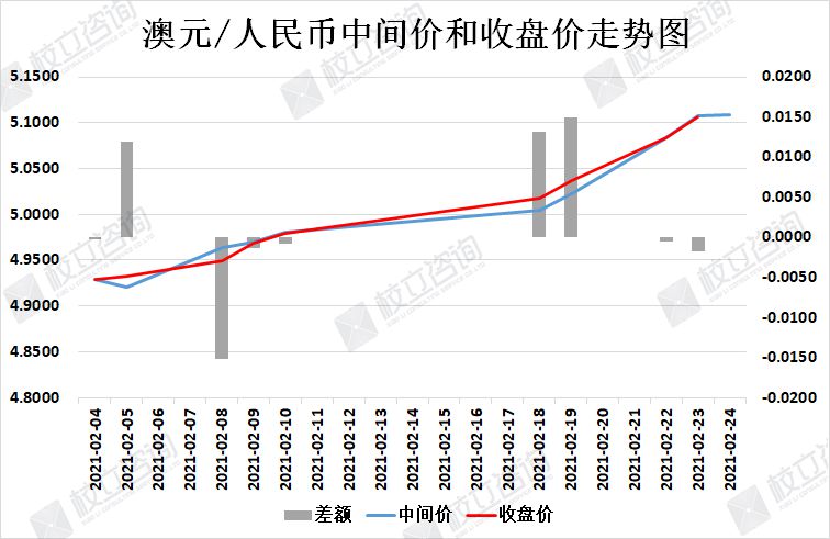2021/2/24:澳元/人民币中间价报5.1091,中间价上调10点。中间价今日略微上调,中间价整体波动幅度仍然较大。上个交易日收盘价低于中间价,日内波幅较大。